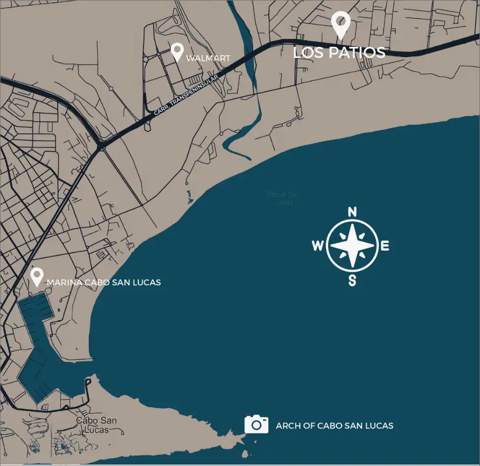 The hotel is located in Cabo San Lucas, Baja California Sur, Mexico, just 10 minutes from the Cabo San Lucas Marina and tourist corridor, with direct visibility on the Transpeninsular Highway.